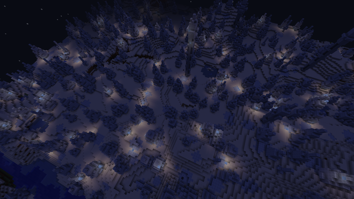 Ice Spikes biome full of Infernal Ice glowing at night.