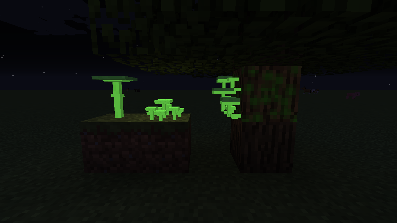 The three glowing mushroom types as well as foxfire in a tree.