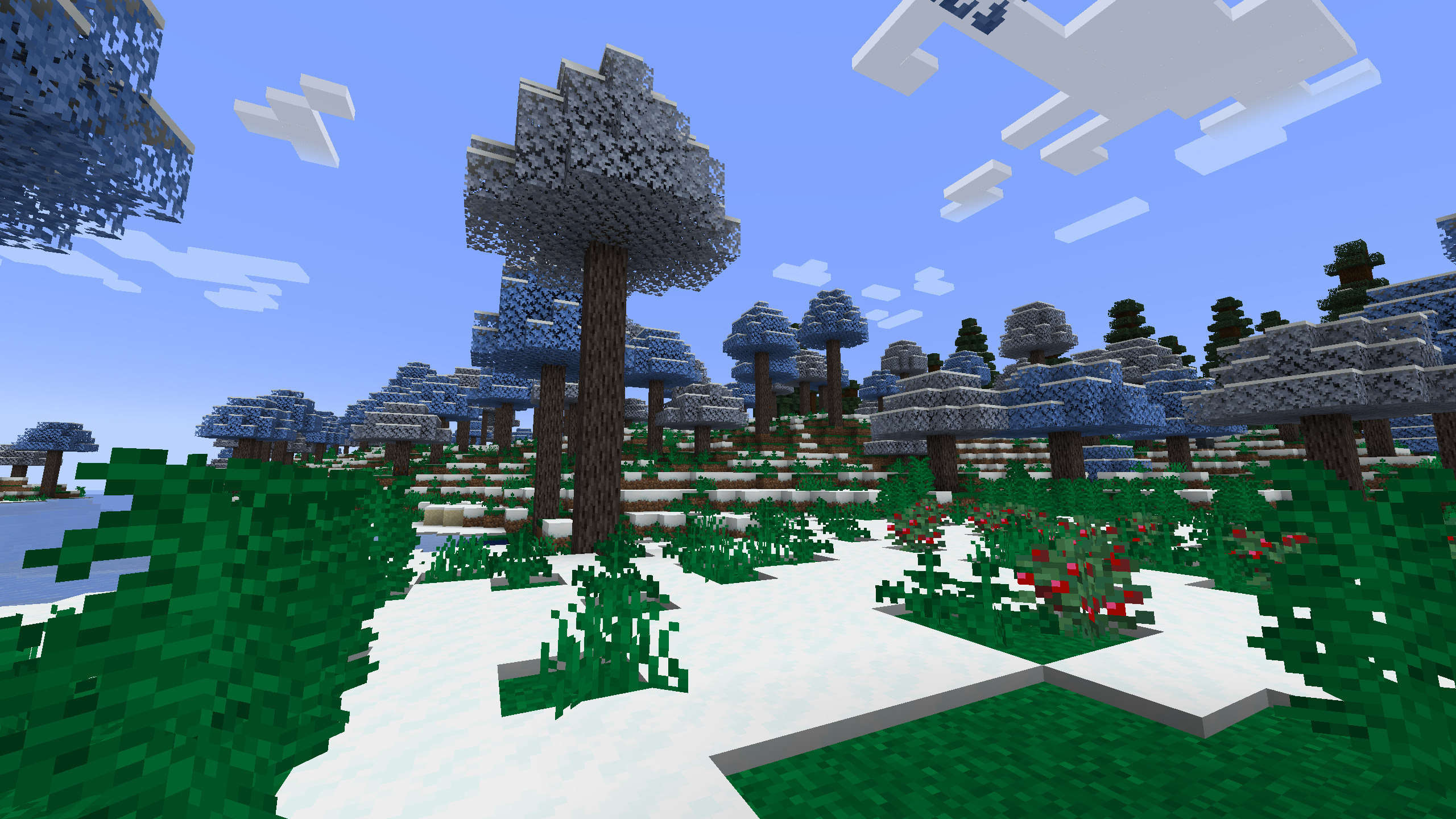 A snowy biome with blue and white maple trees.
