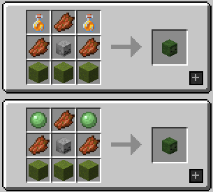 1. row: Honey Bottle (or Slimeball) / Rotten Flesh / Honey Bottle (or Slimeball); 2. row: Rotten Flesh / Skeleton Skull / Rotten Flesh; 3. row: Green Concrete Powder x3 (note that you can't mix Honey Bottle and Slimeball in this recipe)